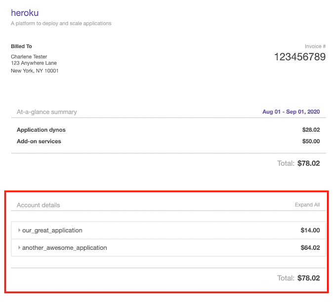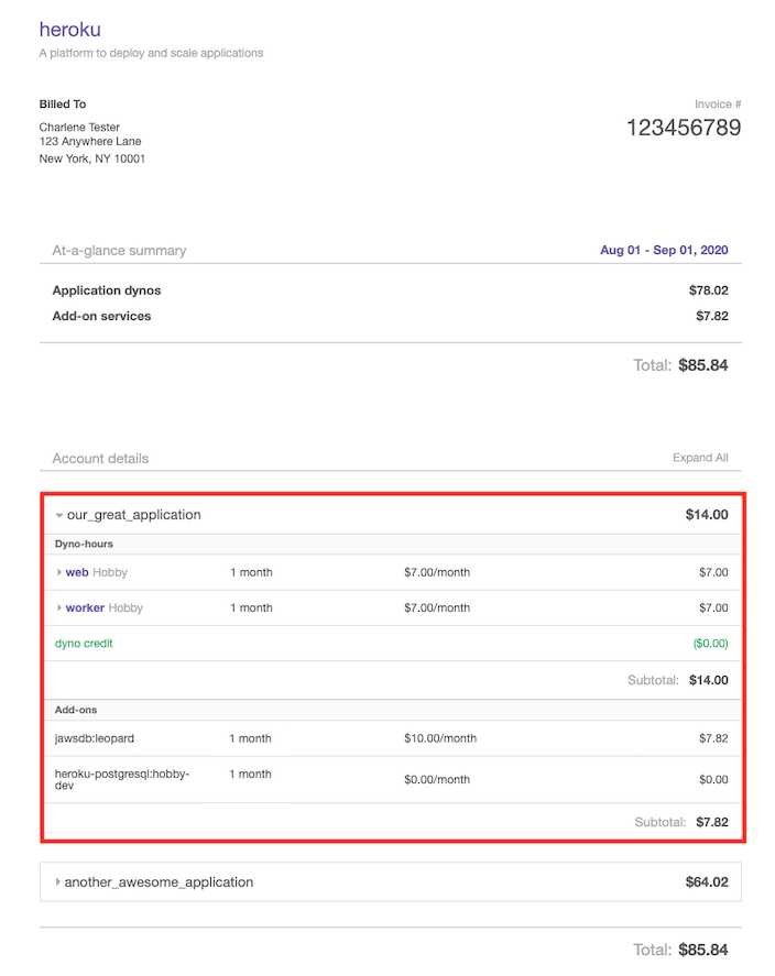 Heroku offers application dynos and add-on services that are represented as separate line items on your invoice. Within each invoice, you'll be able to see a summary of charges, as well as a breakdown of charges for the given month on a per-application basis.