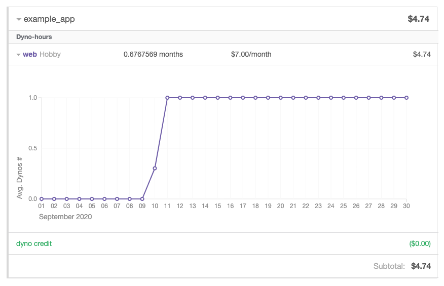The following image shows the at-a-glance summary of your Heroku charges. These charges represent the total of all of your application dynos and all of your Heroku Add-on services.