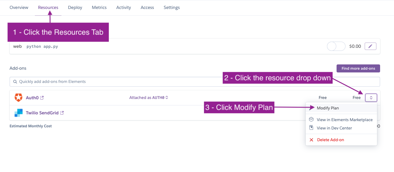 You can manage your add-ons either through the CLI or the Heroku Dashboard web interface.